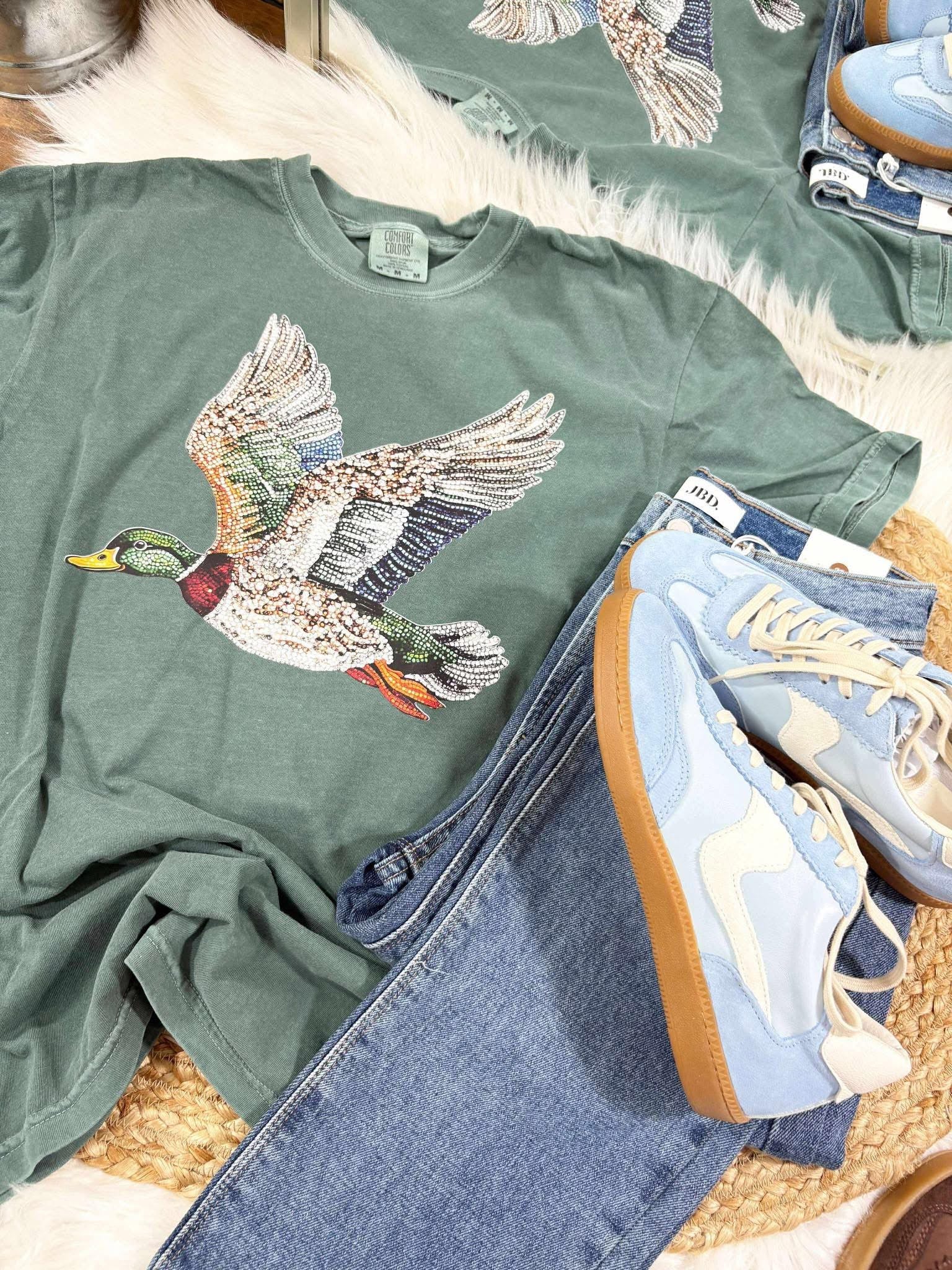Get ready to turn heads with these adorable faux rhinestone shirts featuring a duck, turkey, and deer design. Available in charming green or earthy brown, they add a playful sparkle to your hunting style. Perfect for those who want to showcase their love for the outdoors with a cute and unique twist. Preorder yours now and stand out in the wild!