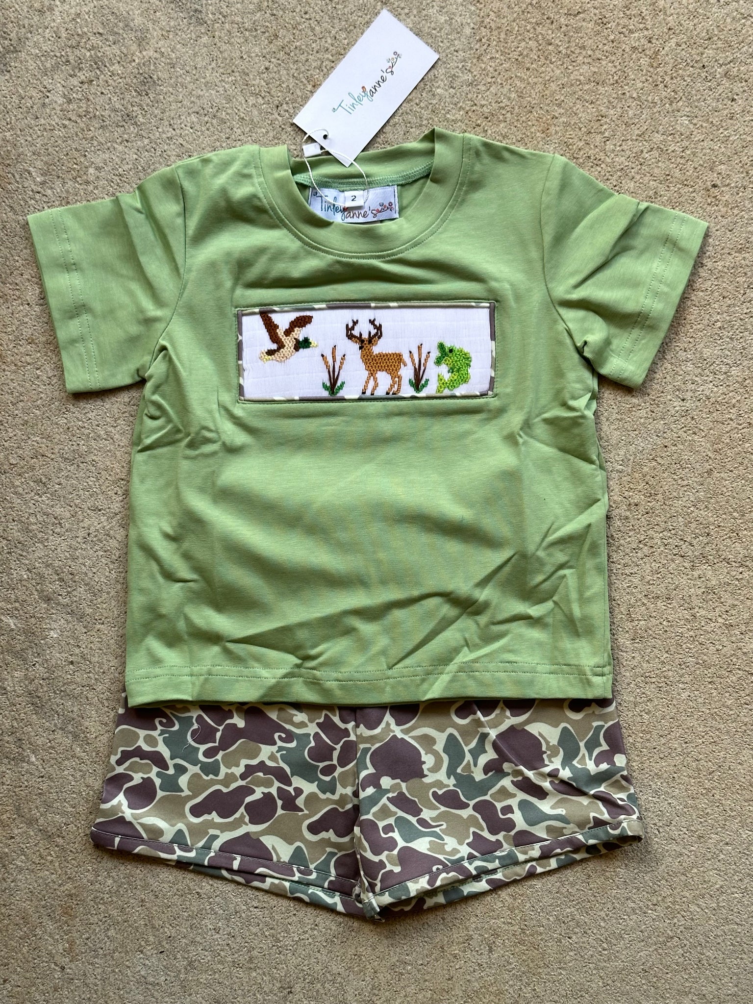 Take on the great outdoors in style with our Outdoor Camo Set. This smock features an eye-catching outdoor scene camo design, perfect for blending into your surroundings. Stay comfortable and fashionable on your next adventure.