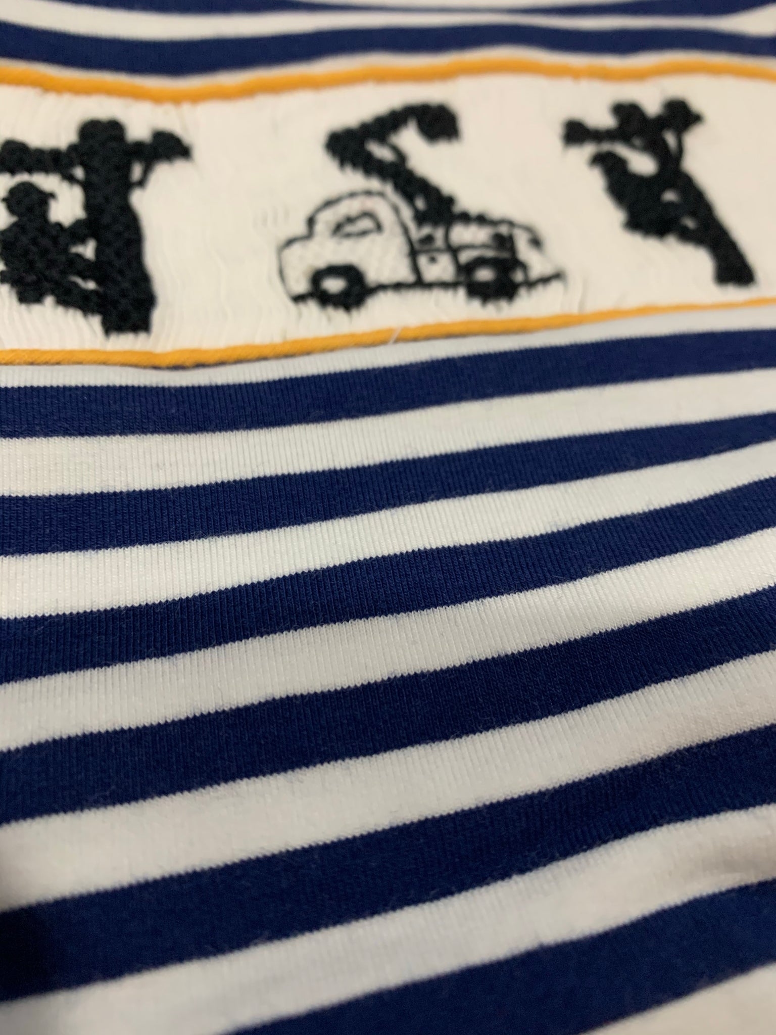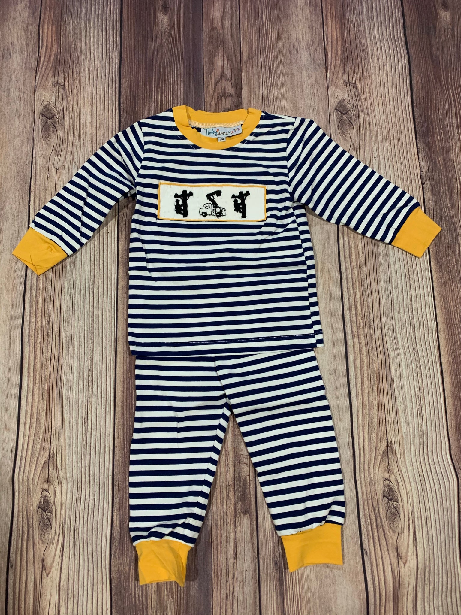 Smocked boy lineman pj set - navy stripes in our soft knit!